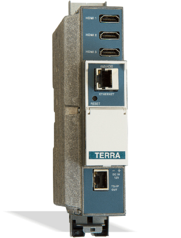 Энкодер MHI430 TERRA - Предназначен для кодирования сигнала HDMI и преобразования в DVB-IP. Кодер принимает три full HD видео сигналы от входов HDMI и преобразует в три SPTS DVB-IP потоки (протоколы UDP/RTP). Кодер поддерживает разрешение HDMI видео сигнала до 1920x1080 60p. Максимальное разрешение кодированного сигнала – 1920x1080 30p.